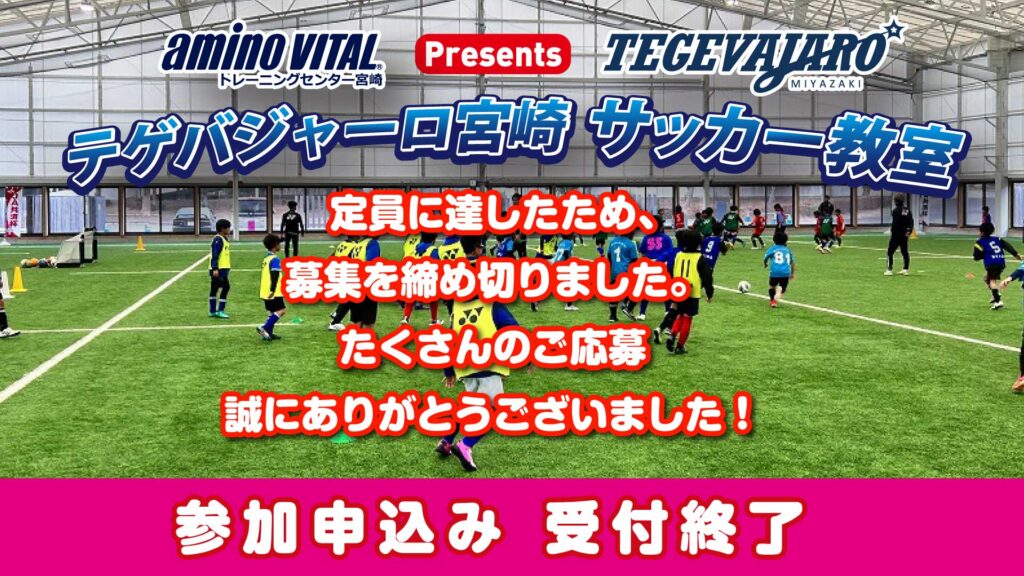 「アミノバイタルトレーニングセンター宮崎 presents テゲバジャーロ宮崎 サッカー教室は、おかげさまで定員に達したため、お申込みを締め切らせていただきました。